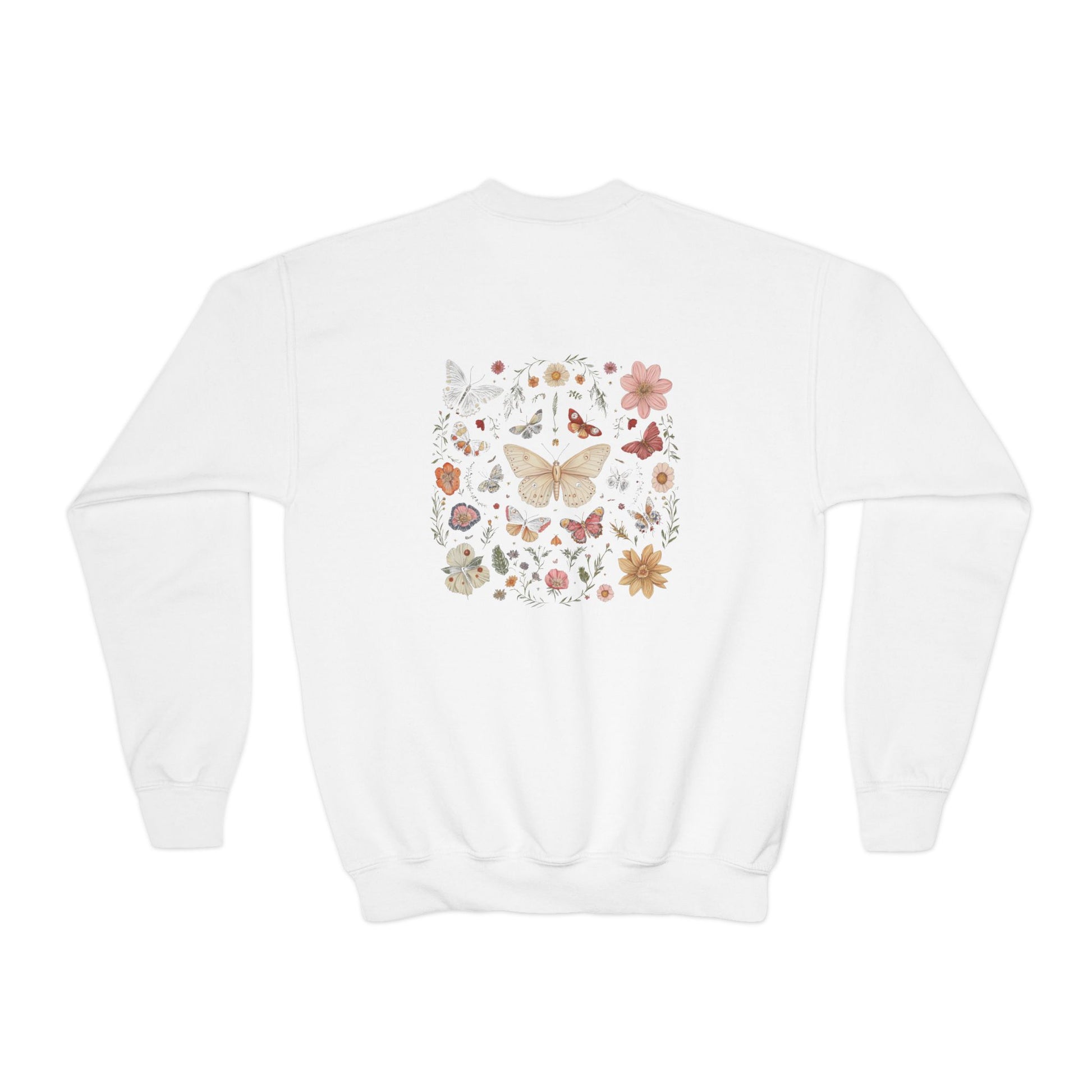 Little blooms, big possibilities. The Bloom & Take Flight Kids Crewneck Sweatshirt is made for comfort and play. A butterfly on the front reminds kids to spread their wings, and the back’s butterfly-and-bloom design celebrates kindness and growth in every season.