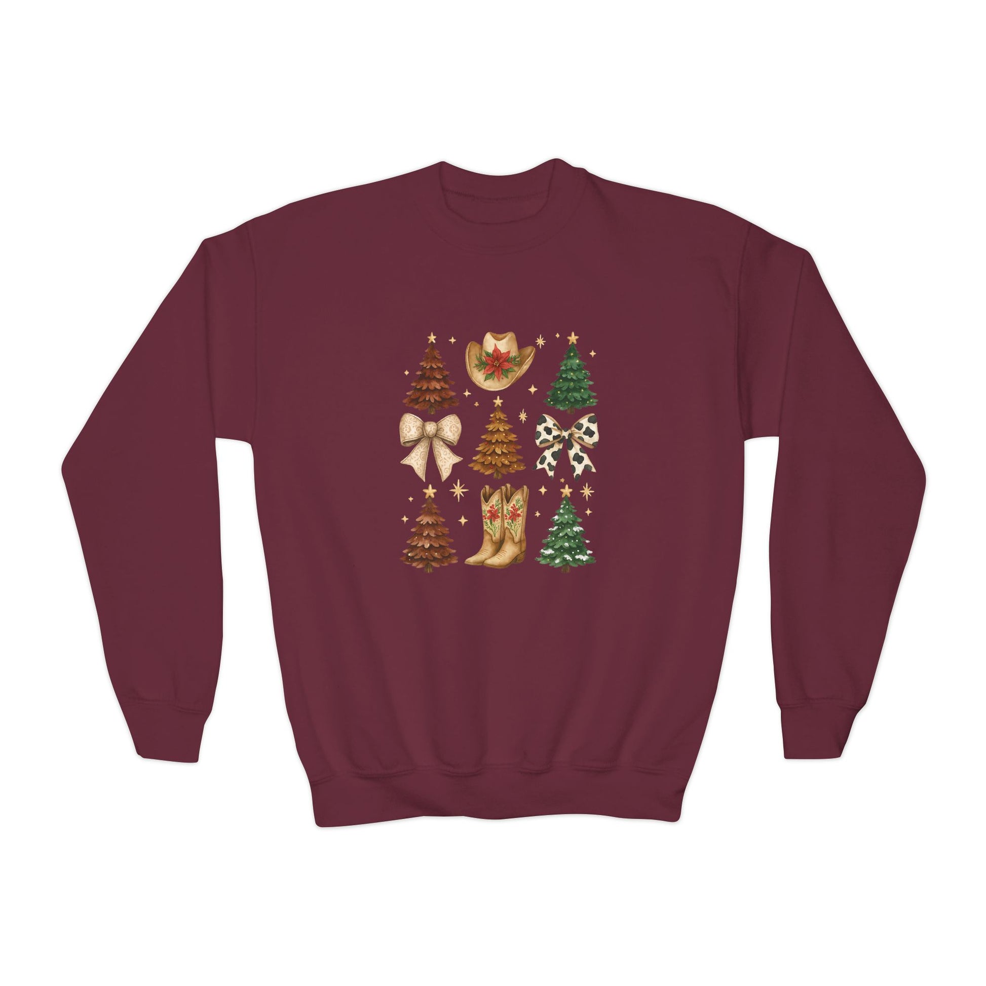 Let your cowgirl celebrate the holidays in cozy western style! Our Cowgirl Christmas youth sweatshirt features a festive mix of cowboy boots, bows, stars, and holiday trees, making it a fun and playful addition to any holiday wardrobe.