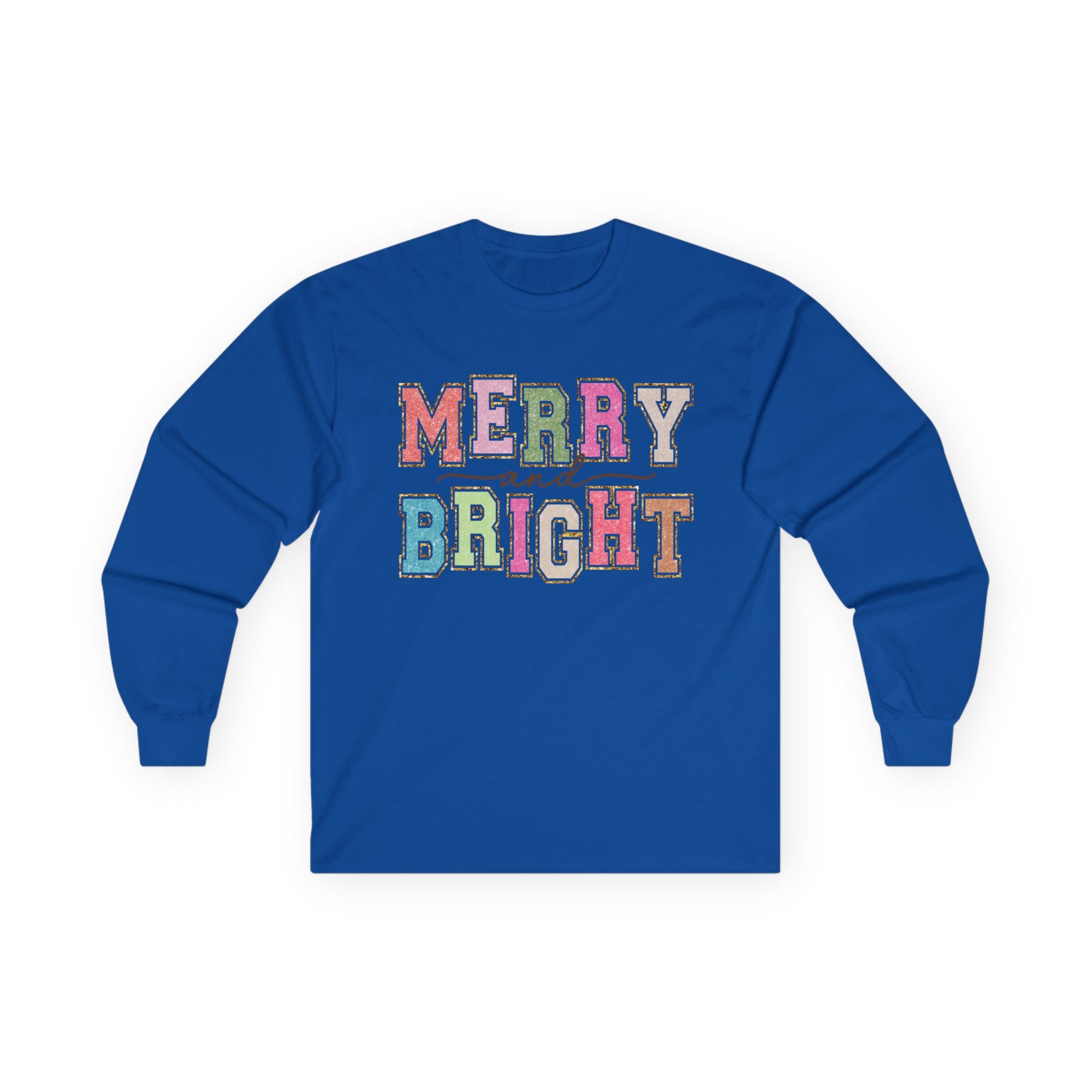 This Merry and Bright long sleeve shirt brings cheerful color and sparkly holiday charm to your winter wardrobe. Designed with a retro varsity inspired font in pastel holiday tones, it is fun and festive without feeling overdone. It also makes an easy gift idea for friends, neighbors, teachers, coworkers, and anyone who loves a colorful holiday vibe.