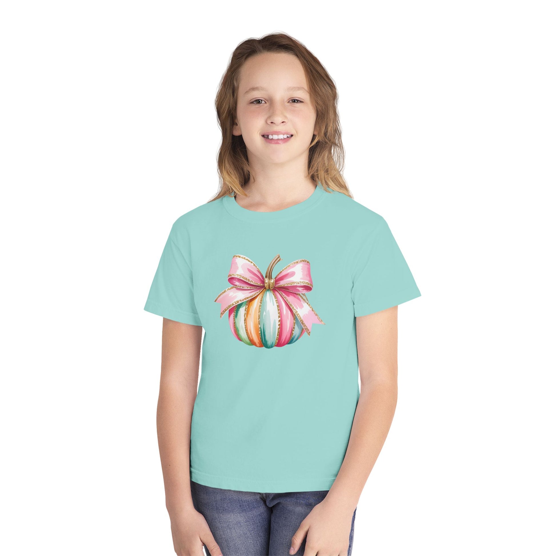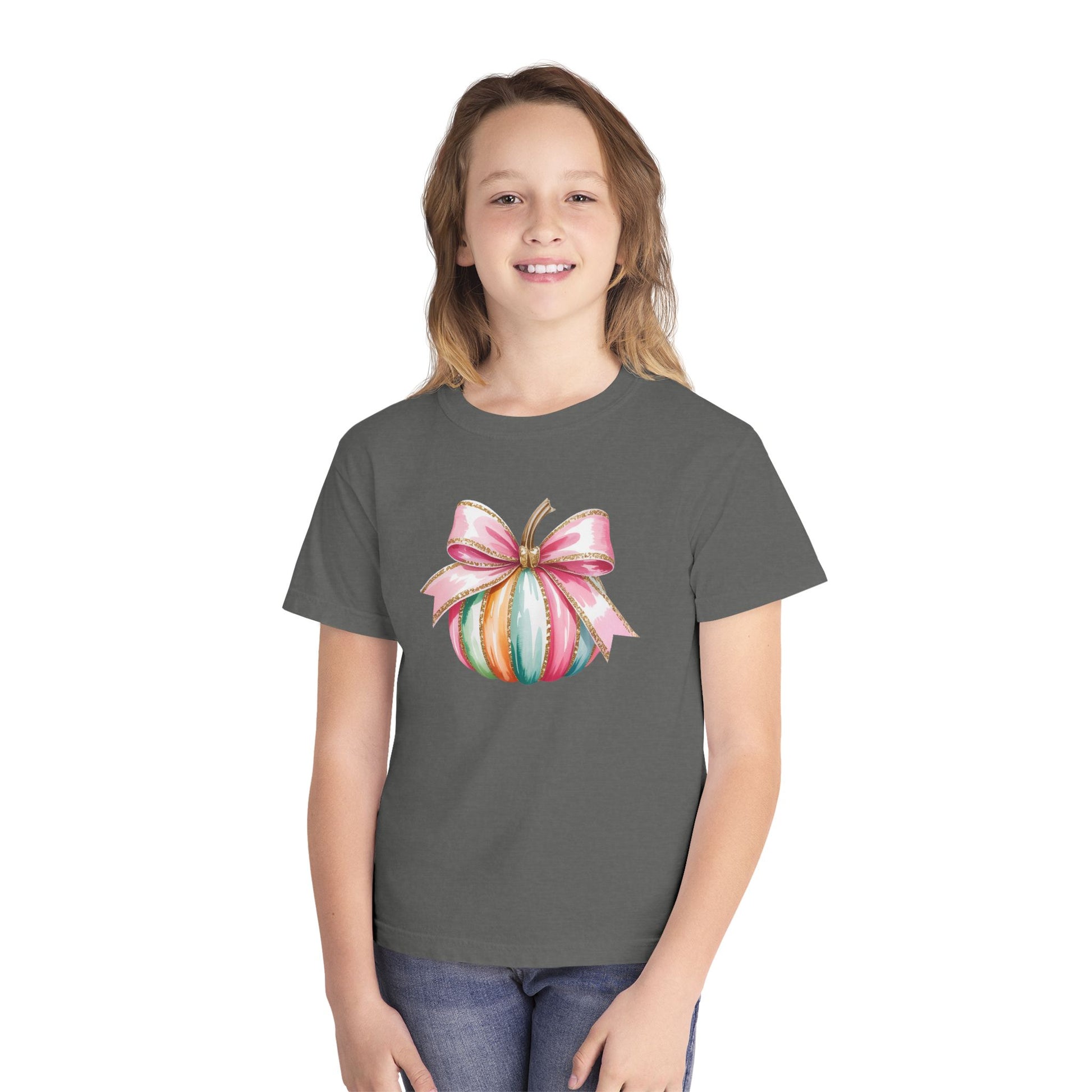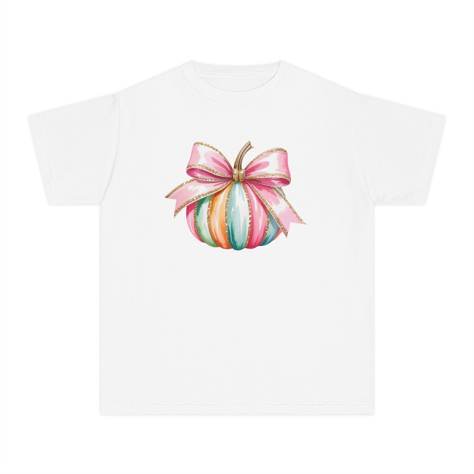 Pastel Pumpkin Bow Kids T-Shirt – Cute Fall Shirt for Girls, Festive Fall Tee, Thanksgiving & Halloween Outfit