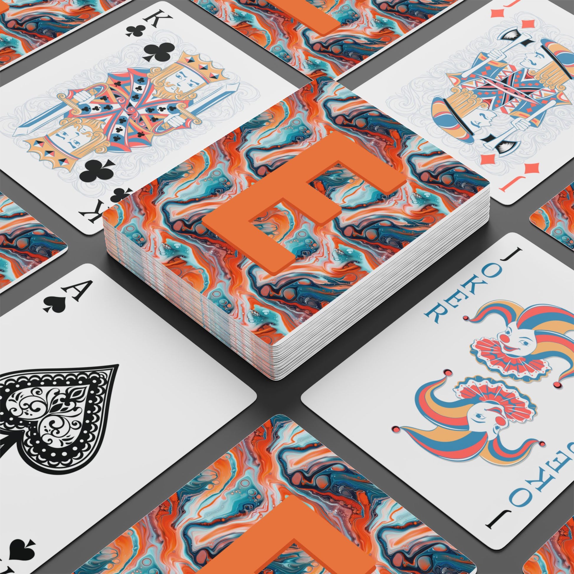This personalized deck of playing cards features a striking abstract marble pattern paired with a custom monogram initial for a bold, yet timeless look. Each deck includes 52 playing cards plus two joker cards, printed on smooth, premium cardstock and sized at 2.5" x 3.5" for easy shuffling and play. The cards come packaged in a clear acrylic case, making them ready for gifting or display.