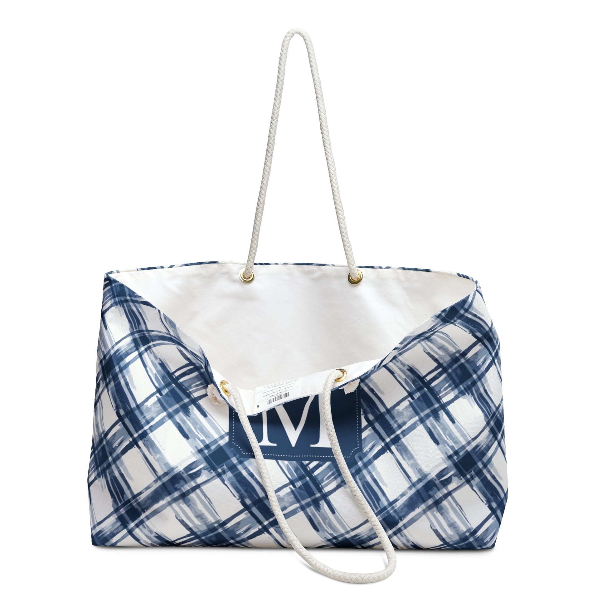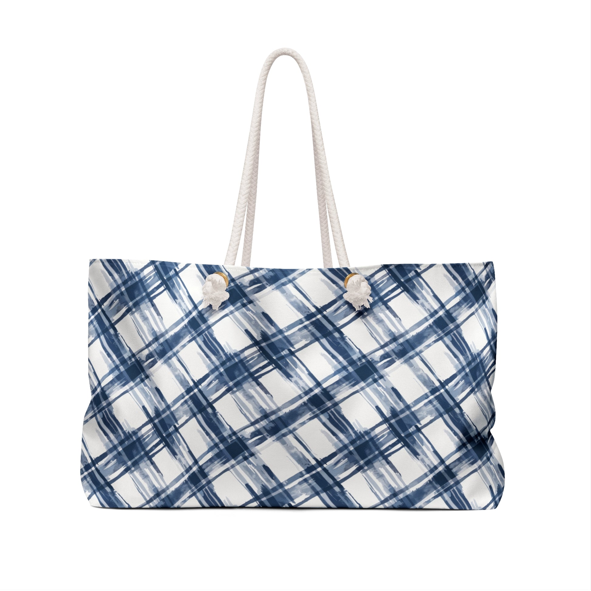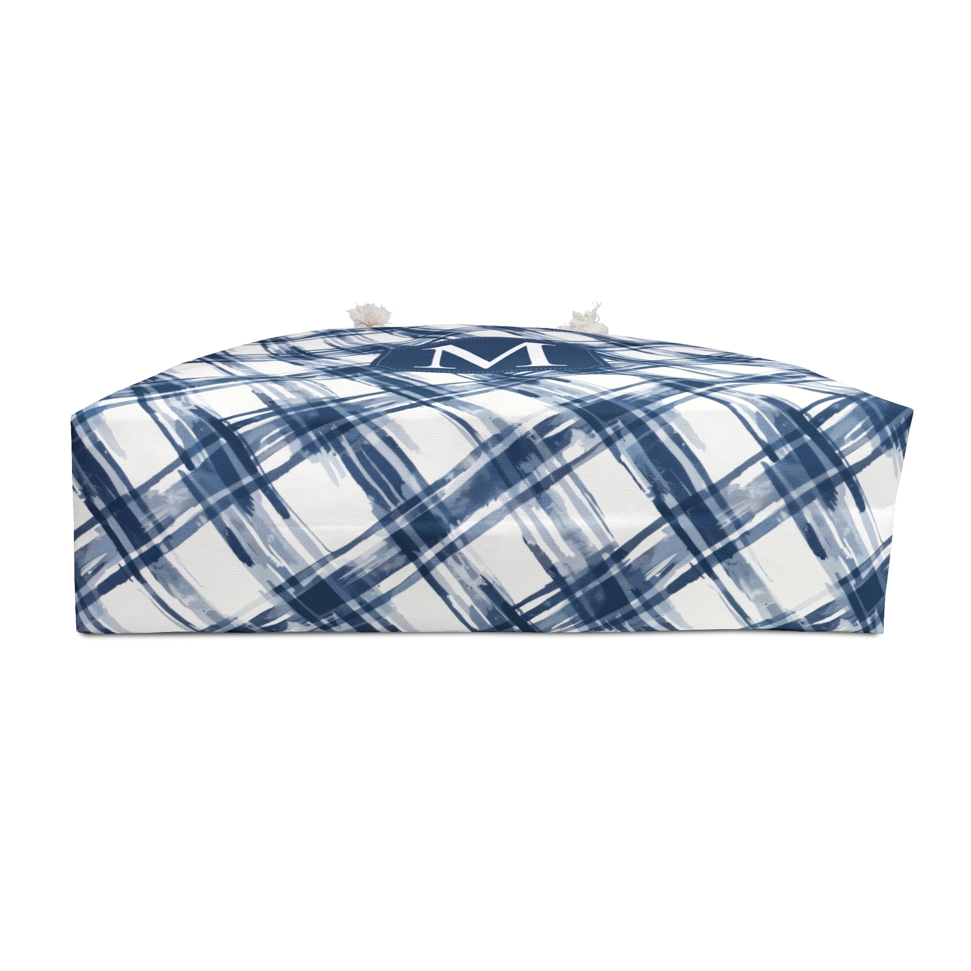 This personalized, oversized rope handle tote features a classic navy and white plaid pattern paired with a bold custom initial for a timeless look. Designed with a wide opening and structured shape, this weekender tote measures approximately 24 inches wide by 13 inches tall, offering generous space for beach days, weekends away, or everyday errands.