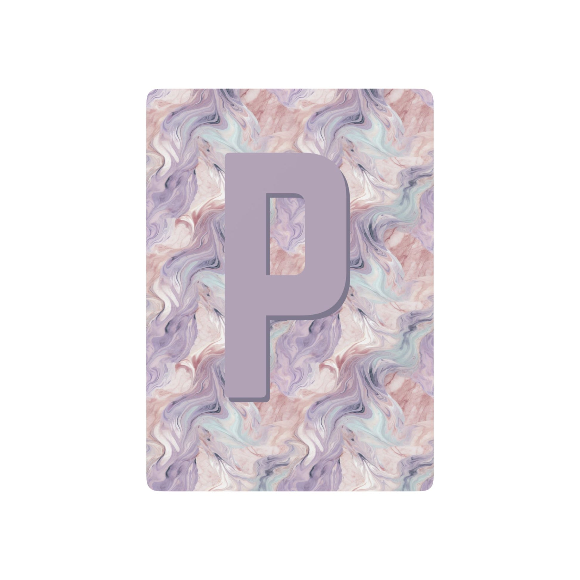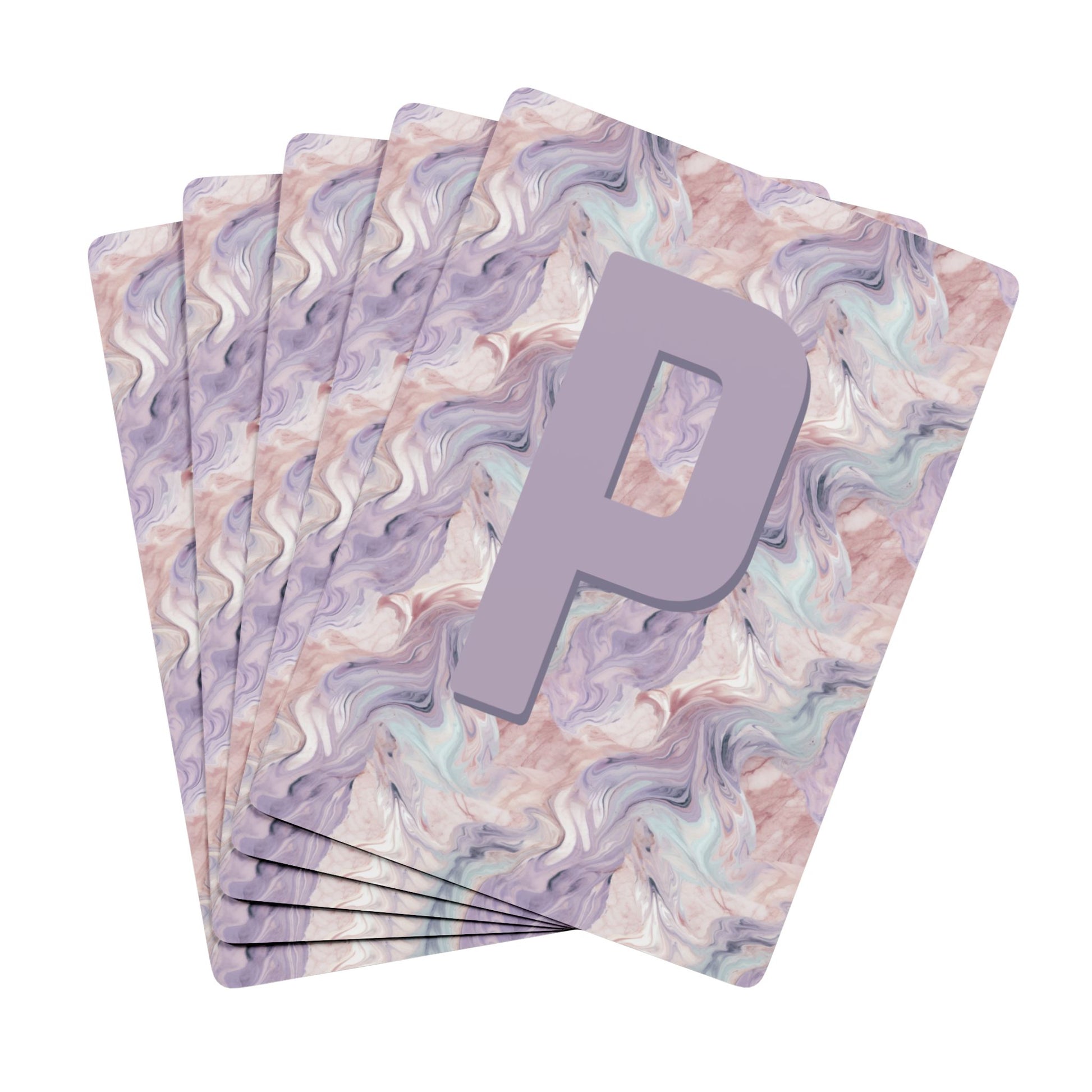 This personalized deck of playing cards features a soft pastel marble pattern paired with a custom monogram initial for a refined, timeless look. Each deck includes 52 playing cards plus two joker cards, printed on smooth, premium cardstock and sized at 2.5" x 3.5" for easy shuffling and play. The cards come packaged in a clear acrylic case, making them ready for gifting or display.