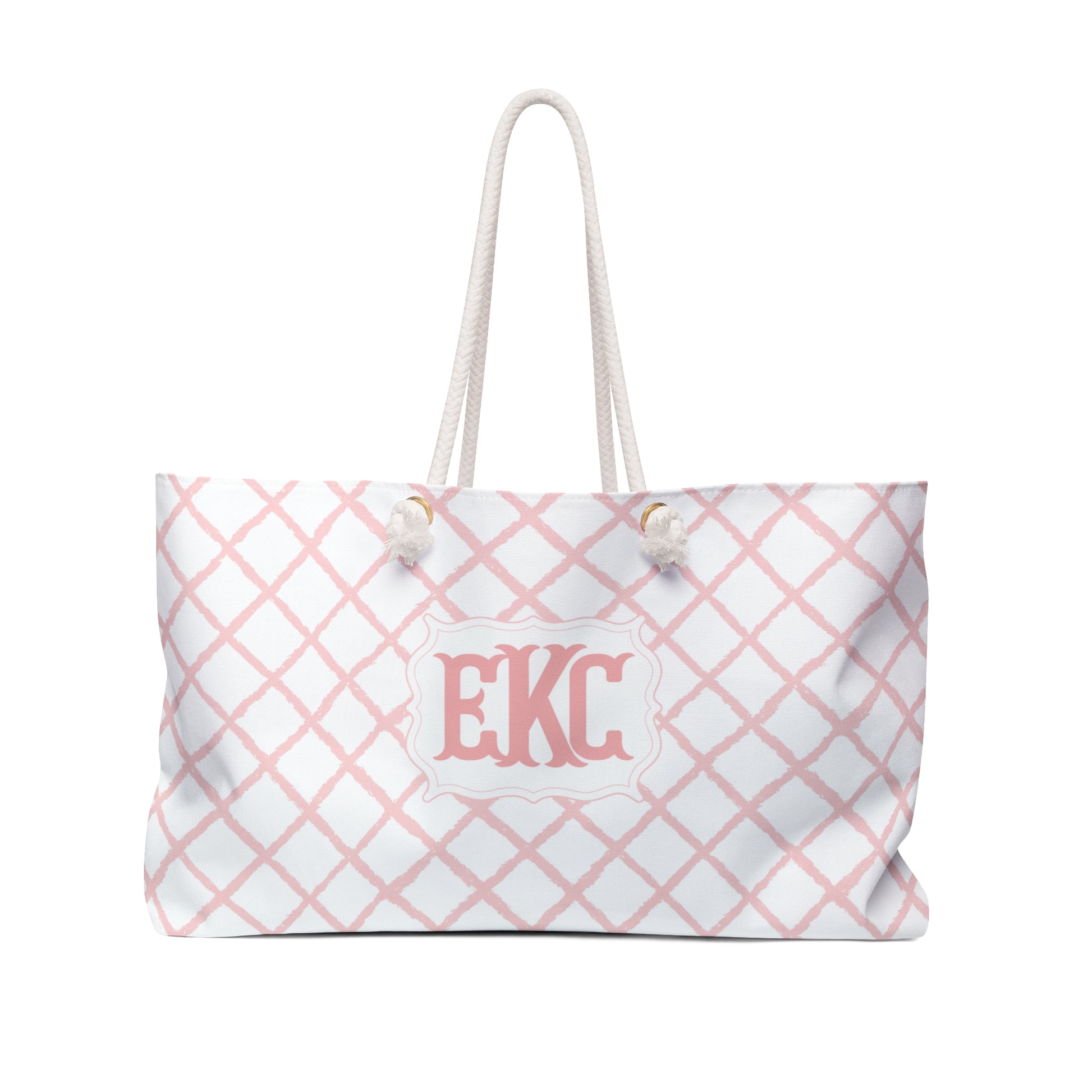 This personalized, oversized rope handle tote features a soft pink lattice pattern paired with a custom initial or monogram for a polished look. Designed with a wide opening and structured shape, this weekender tote measures approximately 24 inches wide by 13 inches tall, offering generous space for beach days, weekends away, or everyday errands.