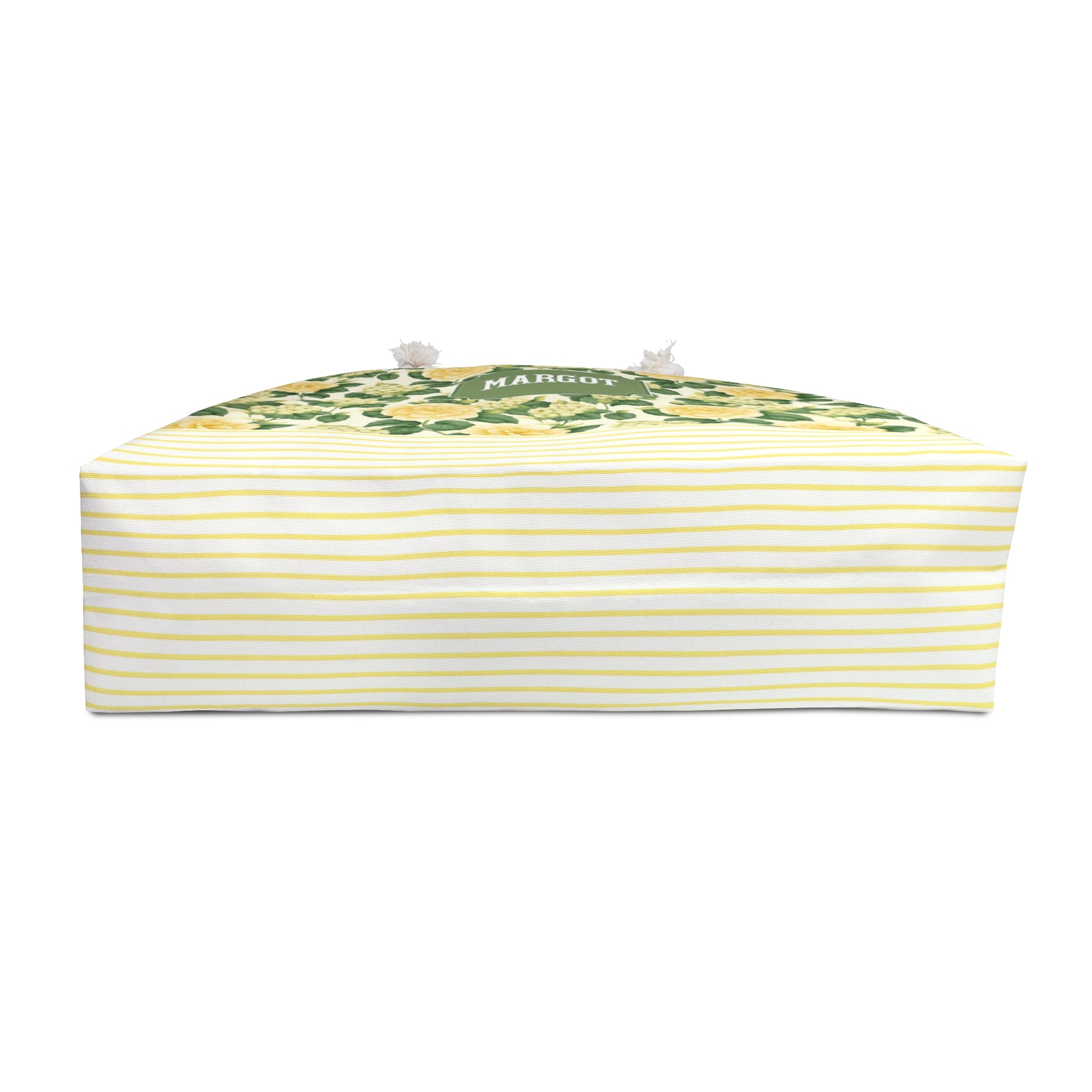 This personalized, oversized rope handle tote features a soft yellow rose floral pattern with fresh green accents, paired with a custom name for a timeless look. Designed with a wide opening and structured shape, this tote measures approximately 24 inches wide by 13 inches tall, offering generous space for beach days, weekends away, everyday errands, or use as a stylish mahjong bag.